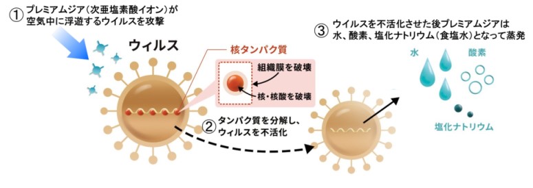 水溶液中で安定しているイオンカプセルは、空気中にスプレーされたり、噴霧させることで中の次亜塩素酸イオン(NaClO-)が細菌やウイルスなどの有機物に反応し、「ウイルス、菌、カビ、ニオイ菌」の核タンパク質を分解し、不活化させます。