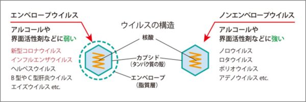 ウイルスには「エンベロープウイルス」と「ノンエンベロープウイルス」という構造の異なる2種類が存在します。